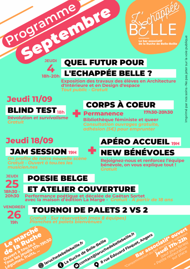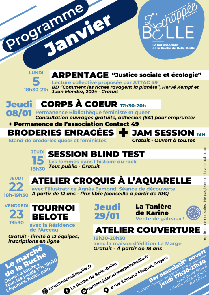Si toi aussi, tu veux essayer de tenir le bar, concocter notre programmation, proposer des animations, 3 solutions s’offrent à toi : t’inscrire directement au bar (en précisant ton numéro), venir au prochain apéro des nouveaux.elles bénévoles (1 RDV/ trimestre) ou nous écrire directement (à laruchedebb@gmail.com) !